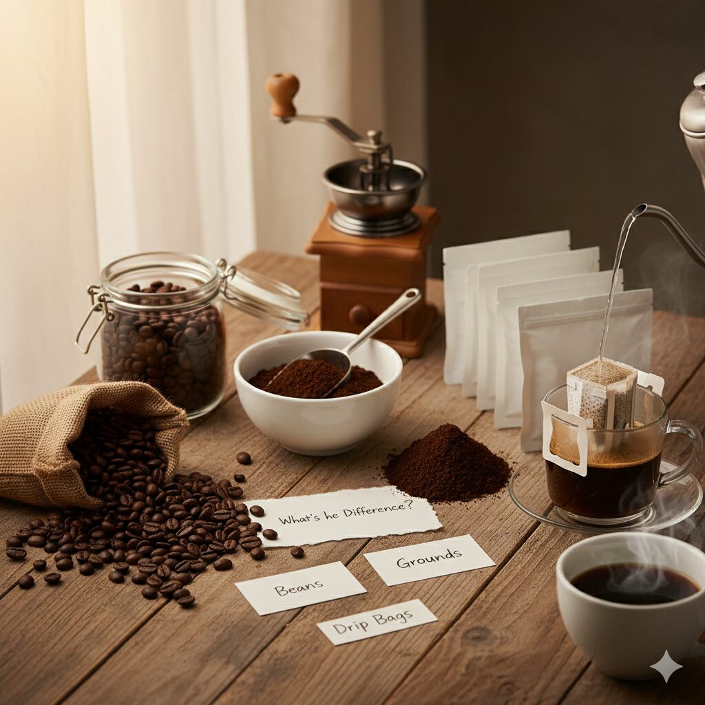 コーヒーの「豆」「粉」「ドリップバッグ」「インスタント」。